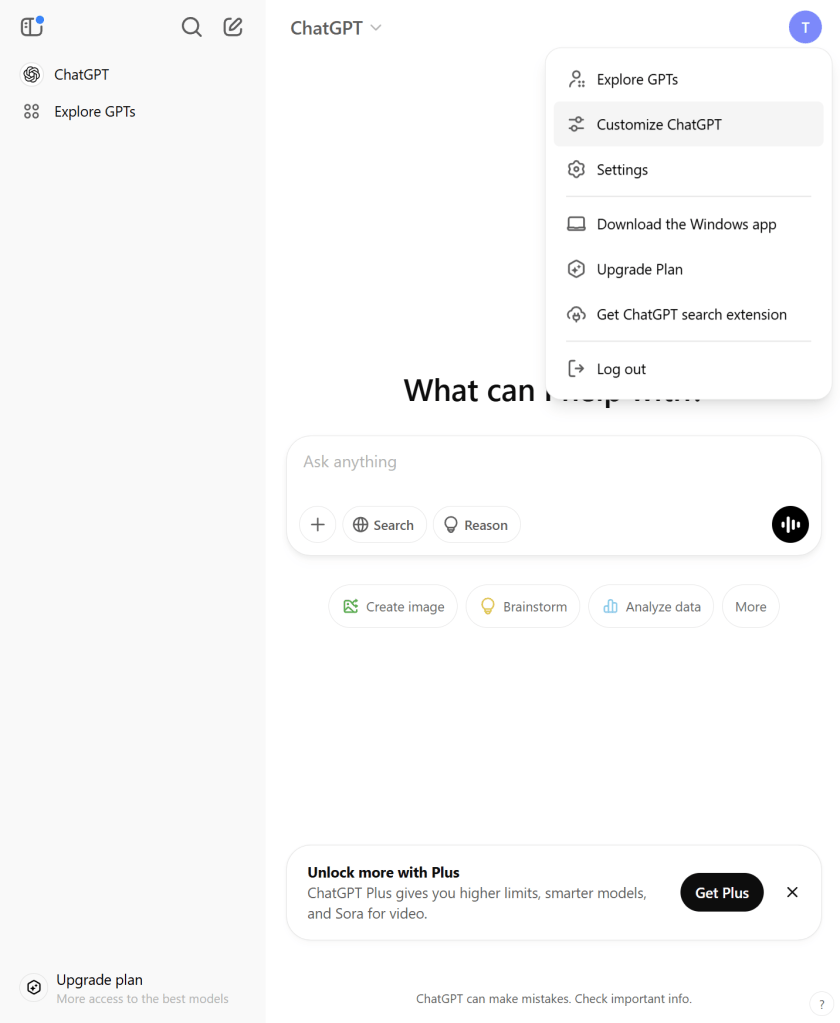 - ขวาบน (ของแอดเป็นรูปตัว T) คือ ศูนย์รวมการตั้งค่าต่างๆ ซึ่งมีปุ่มสร้าง Customize ChatGPT อันนี้แหละที่เราจะมาใช้กัน